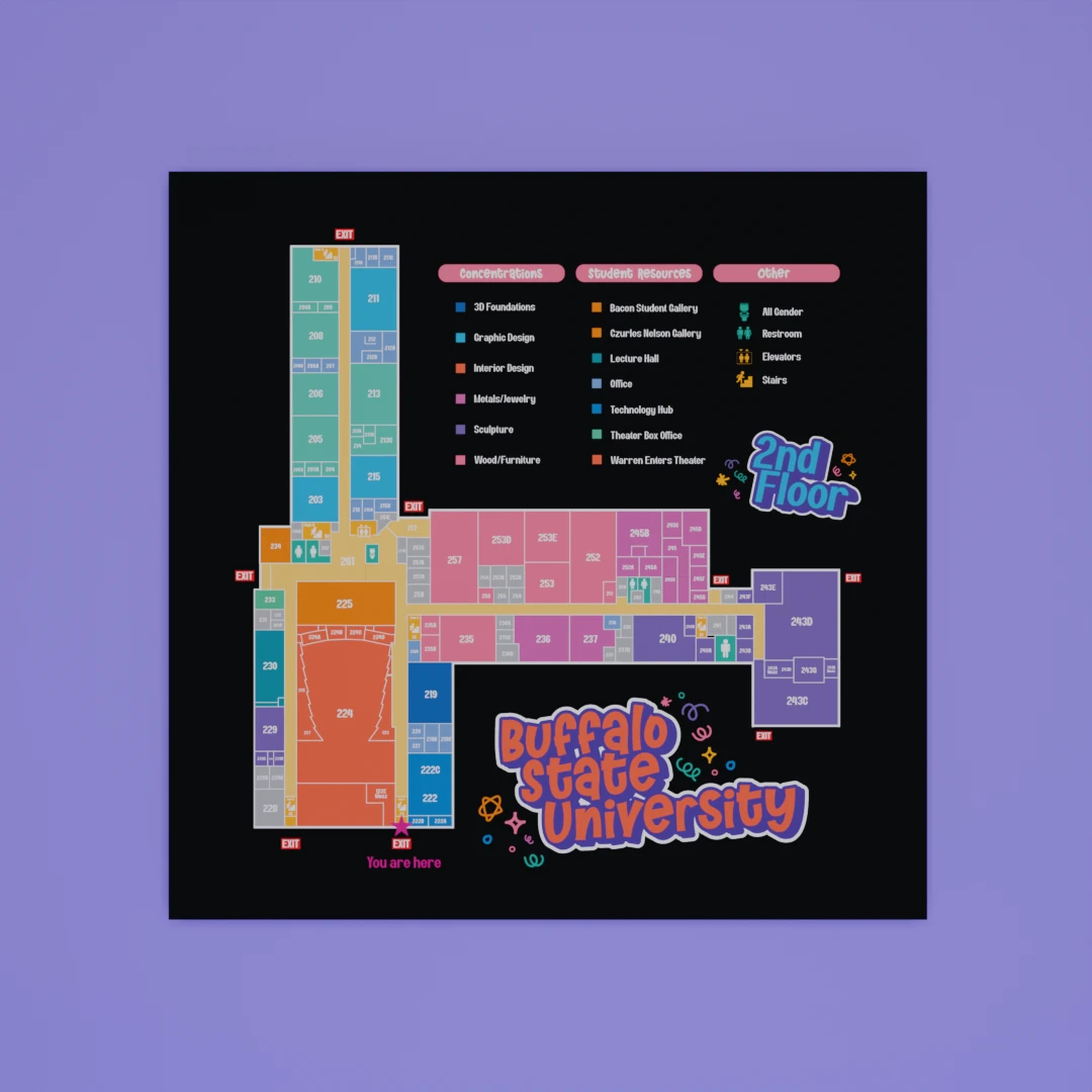 Creating the floor plans of Buffalo State University’s Upton art building, I decided to use vibrant, color-blocked major concentration, where each room have dedicated colors. The design evokes creativity and movement, turning the floor plan into a functional blueprint as well as a colorful visual composition.
